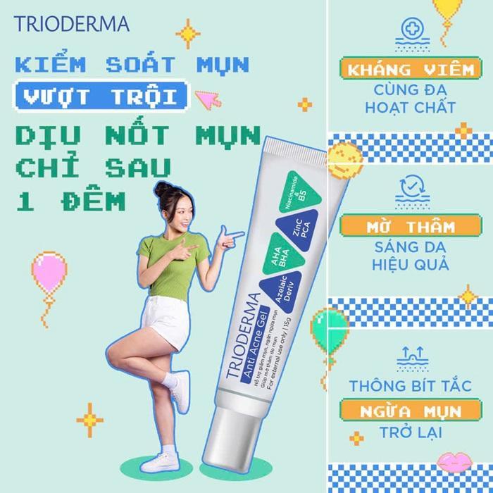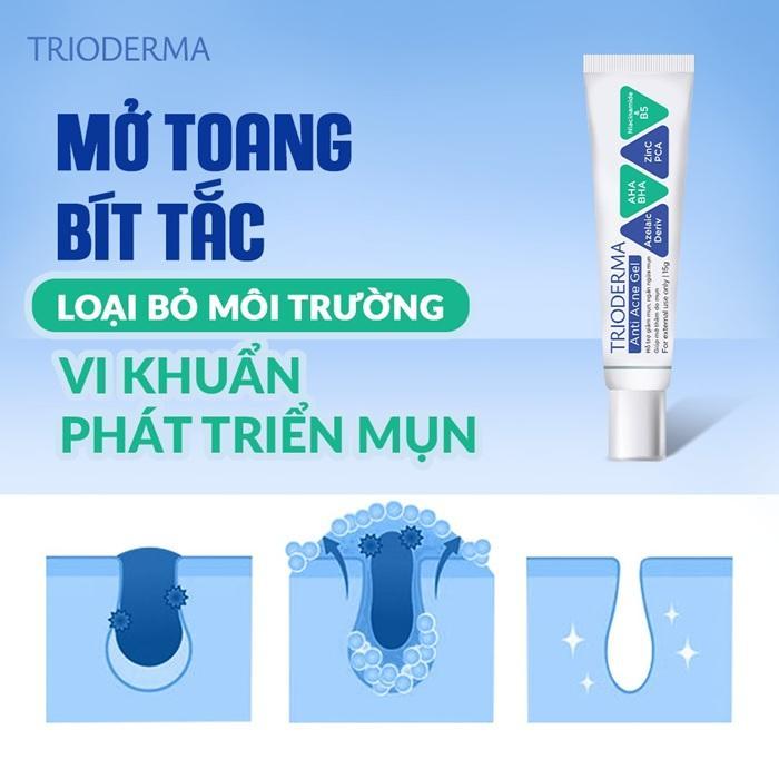 - Mức độ 3 - Chăm sóc tích cực: Tăng cường làm sạch với sữa rửa mặt Trioderma, quay trở lại quy trình trị mụn với gel Trioderma.