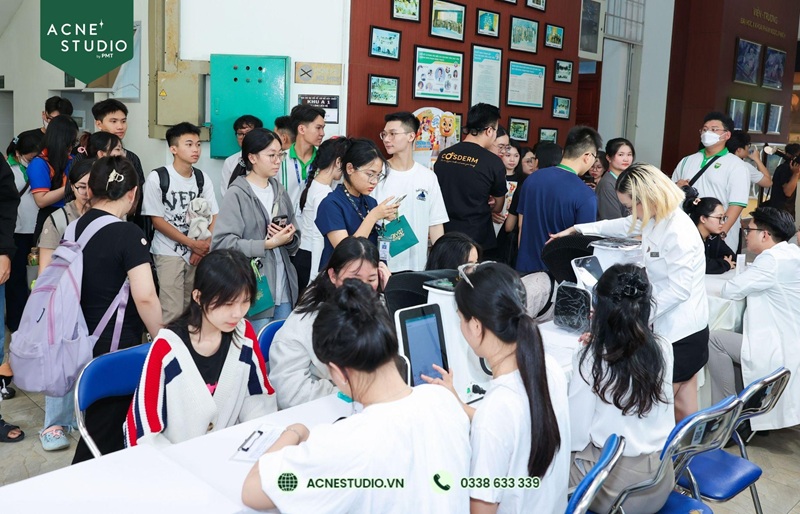Sau màn chào đón đầy hấp dẫn với các phần quà, các bạn sinh viên đã bước vào phần khám phá làn da đầy thú vị. Bằng cách soi da miễn phí với công nghệ hiện đại, mỗi bạn đều có thể "giải mã" làn da của mình, thấu hiểu những vấn đề ẩn sâu dưới từng lớp biểu bì. Dưới sự tư vấn tận tình của các bác sĩ chuyên môn tại ACNE Studio, mọi thắc mắc đều được giải đáp cặn kẽ, giúp các bạn có cái nhìn đúng đắn và khoa học nhất về làn da, từ đó tìm ra lộ trình chăm sóc phù hợp cho riêng mình.